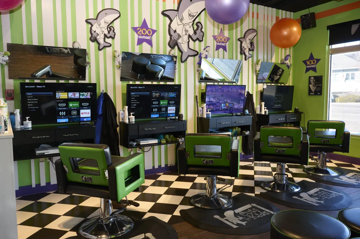 At Sharkey's, all haircuts come with a wash, cut, blow-dry, fun cars or gaming stations, choice of videos, mini-cures, lollipops, and a balloon!